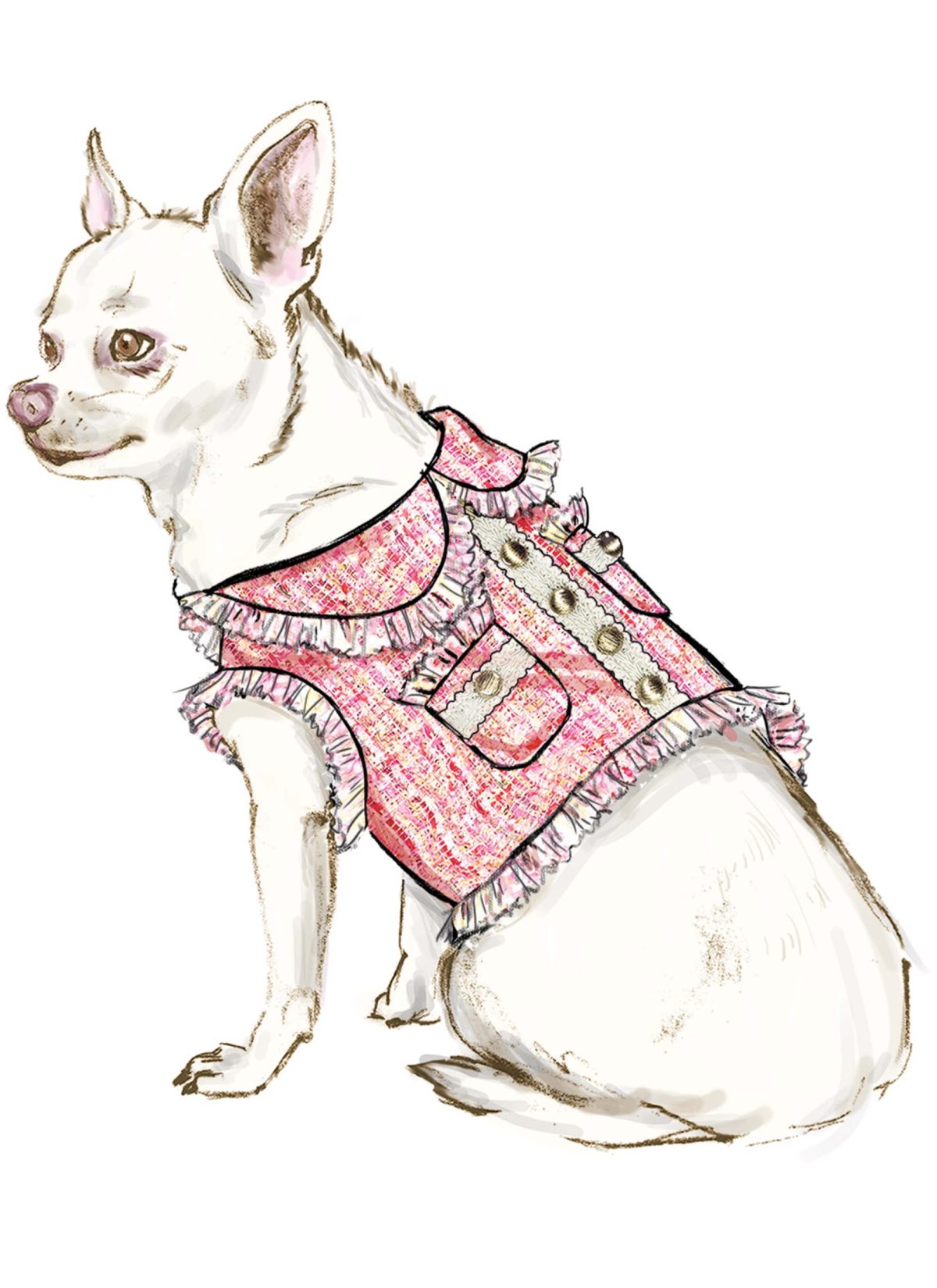 Lined padded coats designed for small and toy breed dogs have hook and loop closures and designer details. Coat with lined collar and patch pockets has self fringe and decorative button trim. Coat with back ruffle and button trim can be made with pearl-trimmed lined collar and purchased flower or with ribbon and braid embellishments. Coat sewn from prequilted fabric has contrast bow, braid trim and hand-sewn pearl accents. See envelope for sizing and more information.