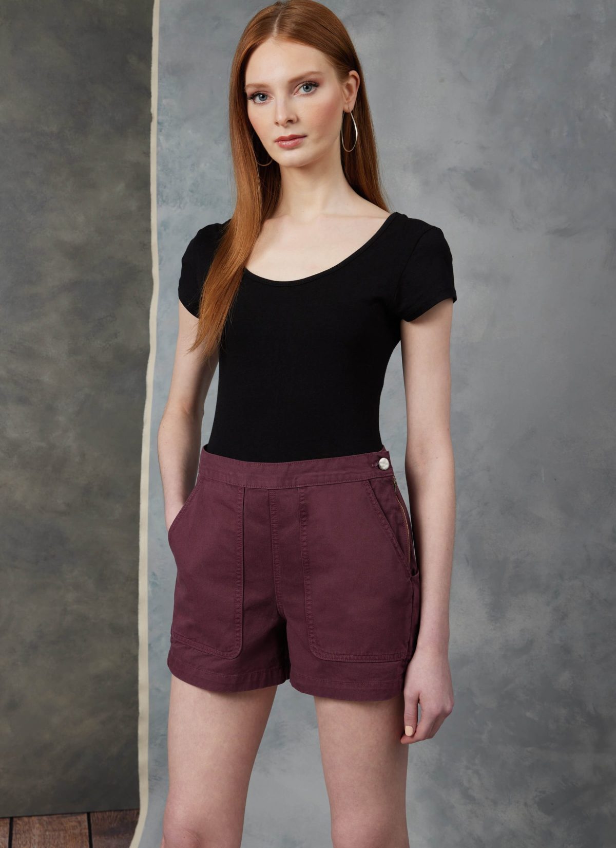 Very loose-fitting pull-on top has dropped shoulders, funnel neckline, long sleeves pleated into cuffs, back zipper and shaped hemline. Shorts, semi-fitted through hip, have front patch pockets, side back pockets, exposed side zipper closure with button fastening at waistband. Sewing skill: Advanced.