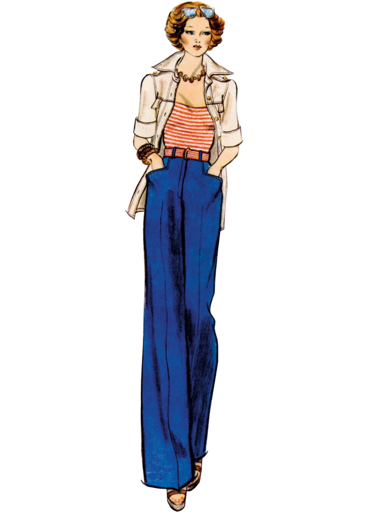 Vintage Vogue Patterns circa 1975. Semi-fitted, partially lined jacket has pointed collar on shaped band, epaulets with carriers and button trim. Front and back yokes, patch pockets with flaps, side slits, short sleeves with turn back cuffs or full-length sleeves pleated into buttoned band cuffs. Front-buttoned simulated band closing and topstitching. Wide, straight-legged trousers, darted into waistband with belt carriers, have western pockets, mock fly front closing and topstitching. Shown with purchased tops and belt. Sew Ratimg: Average.