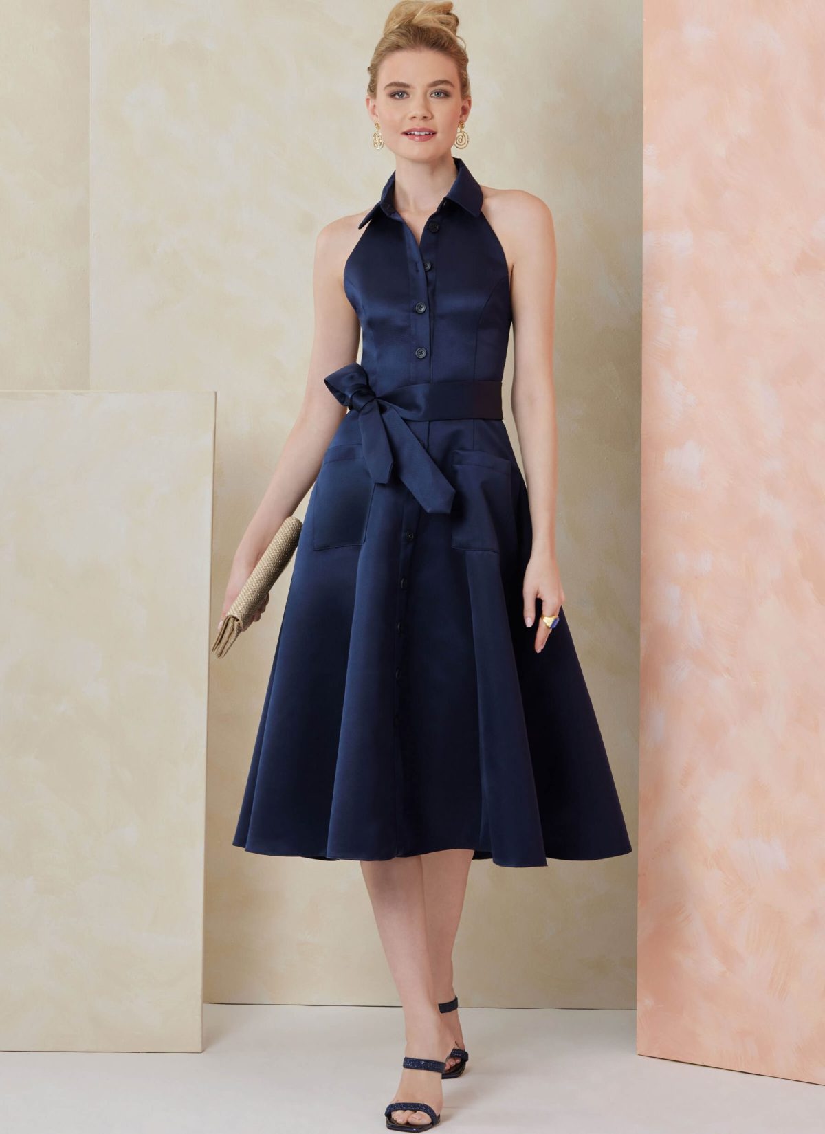 Halter dress in mini or midi length has collar, boning, front button opening and matching tie belt. View B has front patch pockets.