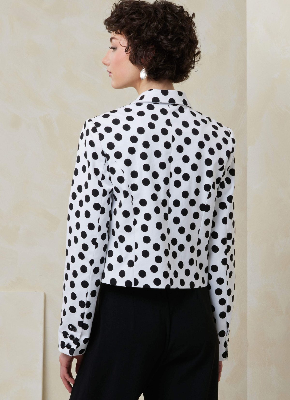 Semi-fitted, lined, cropped jacket has two-piece sleeves with working vent, welt pockets with flap, peak lapels and shoulder pads. View A has detachable bow. View B has contrast lapels and covered buttons.
