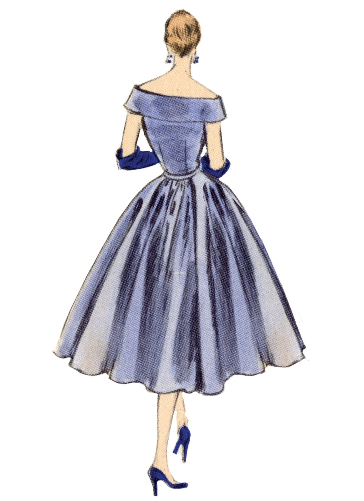 Vintage Vogue Patterns 1954 evening dress pattern. Wide, six gored skirt has wide box pleats either side and joins the bodice at waist-line. A shaped band at the wide, low neck-line. Bodice is lined and boned. Authentic Vintage Reproduction includes additional size options and cutting layouts.