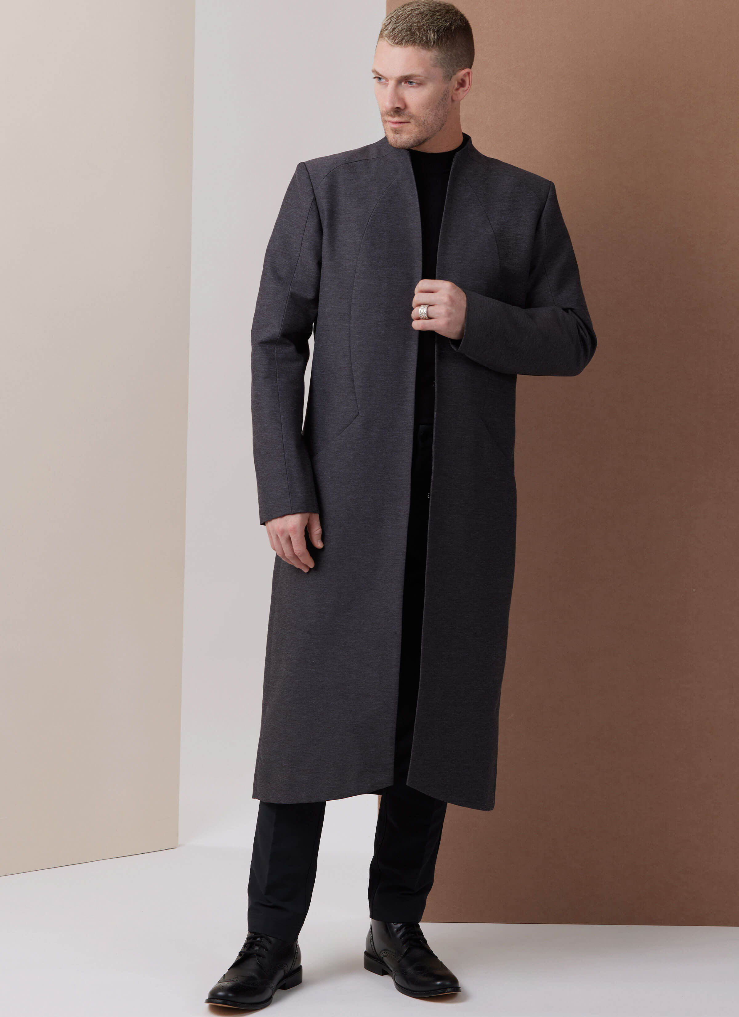 Fully lined men’s jackets feature an architecturally structured silhouette with stylized two-piece raglan sleeves. Design details include front in-seam pockets and a clean hook-and-eye front closure. View B adds a shaped hem and a back kick pleat for added movement and style.